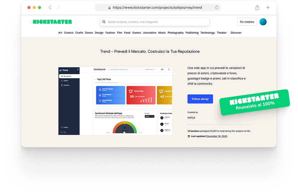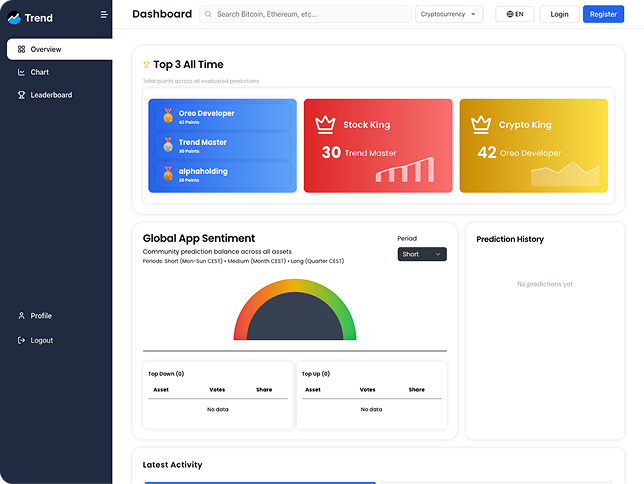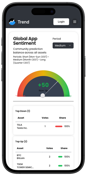 La dashboard di Trend ti mostra in tempo reale come si muove il sentiment della community su azioni e crypto. Vedi subito se prevale l’ottimismo o la cautela e come cambia nel tempo, così puoi farti un’idea dell’andamento generale del mercato.